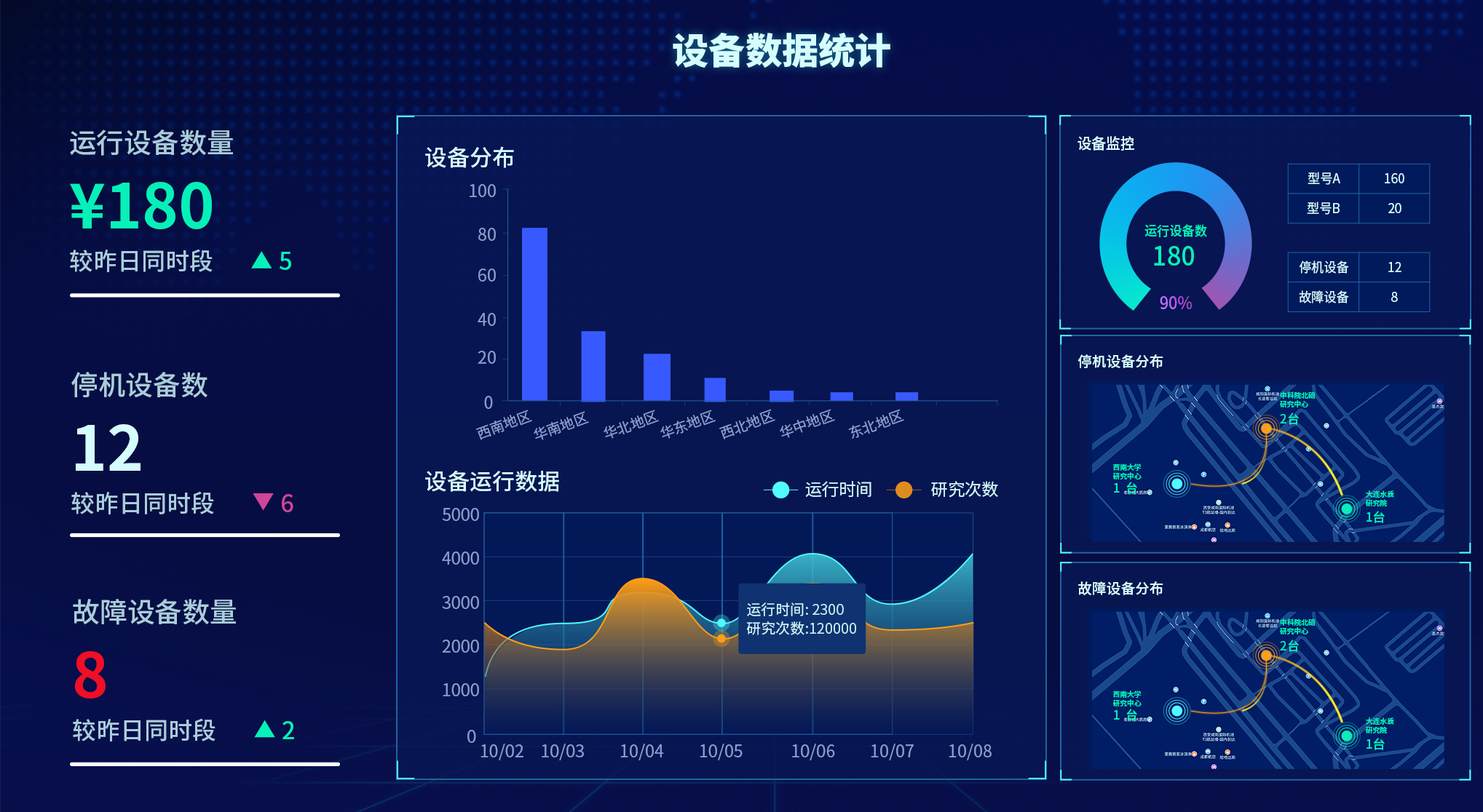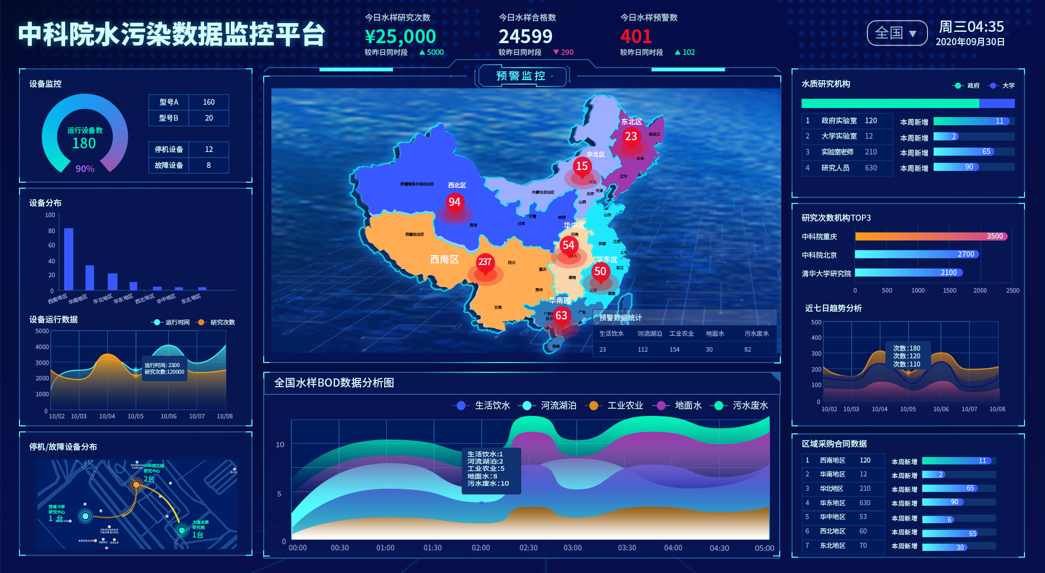 云平臺的主顯示界面可實時動態(tài)顯示儀器的運行狀態(tài)、儀器的全國分布狀態(tài)、在線水質(zhì)測試情況,用戶界面可實時上傳下載用戶數(shù)據(jù),便于管理,耗材更新及數(shù)據(jù)分享功能,后臺維護界面可收集用戶授權(quán)數(shù)據(jù),進行大數(shù)據(jù)分析,管理云平臺及推送更新信息;云平臺將儀器、用戶以及監(jiān)測點通過大數(shù)據(jù)傳輸構(gòu)建到一起,為智慧水生態(tài)環(huán)境的發(fā)展提供有力的保障。