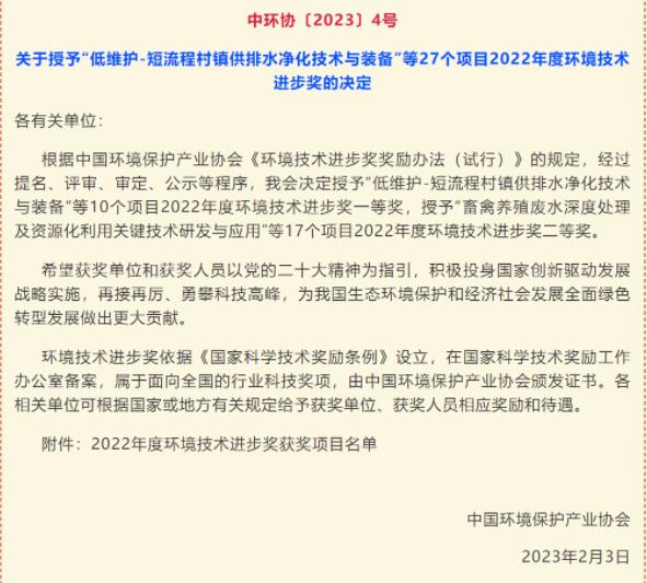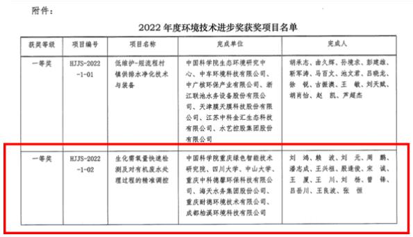 近日,中國環境保護產業協會發布《關于授予“低維護-短流程村鎮供排水凈化技術與裝備”等27個項目2022年度環境技術進步獎的決定》(中環協〔2023〕4號),由我司參與,中國科學院重慶綠色智能技術研究院牽頭的項目“生化需氧量快速檢測及對有機廢水處理過程的精準調控”榮獲2022年度環境技術進步獎一等獎。