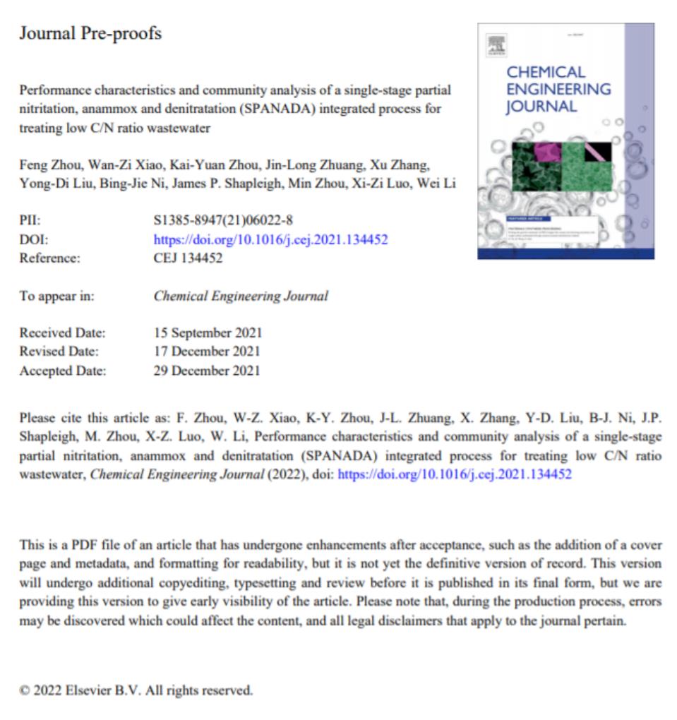 華東理工大學(xué)用我公司生產(chǎn)的BOD-Q水質(zhì)測定儀采集的BOD數(shù)據(jù)在國際期刊《Chemical Engineering Journal》上發(fā)表題為“Performance characteristics and community analysis of a single-stage partial nitritation, anammox and denitratation (SPANADA) integrated process for treating low C/N ratio wastewater”的論文,研究使用我司生產(chǎn)的BOD-Q水質(zhì)測定儀對低C/N比廢水的BOD進行了測定,該論文的發(fā)表標志著我司儀器的測定數(shù)據(jù)具有高度的精準性和可靠性,為今后科研人員了解并使用我司研發(fā)的儀器提供有益的參考。