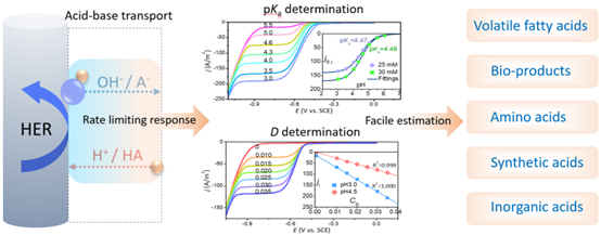 近日,中心副研究員殷逢俊在前期酸堿傳質(zhì)理論研究基礎(chǔ),利用電極界面過程酸堿傳質(zhì)信號(hào),創(chuàng)新提出了一種能同時(shí)測(cè)定酸堿物質(zhì)解離常數(shù)和擴(kuò)散系數(shù)的電化學(xué)方法,系統(tǒng)測(cè)定了二十余種弱酸物質(zhì)的實(shí)際參數(shù)值,研究成果先后在Electrochimica Acta和Industrial & Engineering Chemistry Research上發(fā)表學(xué)術(shù)論文2篇:“A Novel Electrochemical Method Determining pKa and Transport Parameters of Buffers Using Acid-Base Transport Limitation Response”, doi.org/10.1016/j.electacta.2023.143373,“Determining pKa and a New Total Diffusion Coefficient for Weak Acids via the Electrochemical Acid-base Transport Limitation Method”,doi.org/10.1021/acs.iecr.3c02856。解離常數(shù)和擴(kuò)散系數(shù)是理解和利用弱酸、弱堿緩沖物質(zhì)的兩個(gè)基本參數(shù),然而傳統(tǒng)測(cè)定方法普遍較為復(fù)雜,應(yīng)用普及度不高,很多物質(zhì)都還缺乏參數(shù)數(shù)據(jù)儲(chǔ)備。相關(guān)原理已至少提出30年,方法研究進(jìn)展緩慢,特別是同時(shí)測(cè)定解離常數(shù)和擴(kuò)散系數(shù)的方法尚未有報(bào)道。本研究提出的電化學(xué)方法測(cè)定簡(jiǎn)單快速,對(duì)實(shí)驗(yàn)人員要求低,無需復(fù)雜算法和大型設(shè)備,易于開發(fā)為自動(dòng)化設(shè)備。本方法測(cè)定的擴(kuò)散系數(shù)是一種新形式,代表一個(gè)共軛酸堿對(duì)的擴(kuò)散系數(shù)平均值,不隨酸堿物質(zhì)解離度和濃度變化,克服了傳統(tǒng)測(cè)定參數(shù)結(jié)果的一大限制。