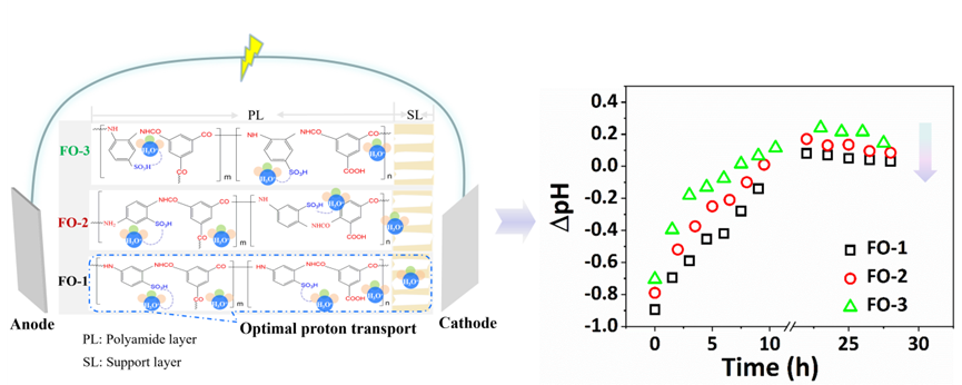 滲透微生物燃料電池(OsMFC)存在質(zhì)子傳輸緩慢的問題,導(dǎo)致陰陽兩極間pH失衡,電池整體性能下降。在OsMFC中,正滲透(FO)膜在質(zhì)子傳輸中起著至關(guān)重要的作用。本研究將高質(zhì)子傳導(dǎo)載體磺酸基引入到FO膜分離層,通過改變磺酸基在苯環(huán)上的位置,實現(xiàn)對質(zhì)子傳輸性能的精準(zhǔn)調(diào)控,當(dāng)磺酸基與氨基在苯環(huán)上處于鄰對位時,制得了最佳質(zhì)子傳導(dǎo)的FO膜,同時負(fù)載此膜的OsMFC在汲取水量、最大功率密度及污染物去除方面均得到顯著提升。本研究提出的在分子水平上引入質(zhì)子傳導(dǎo)載體的方法,為緩解陰極pH的上升,實現(xiàn)OsMFC的規(guī)模化應(yīng)用提供了新的視角。