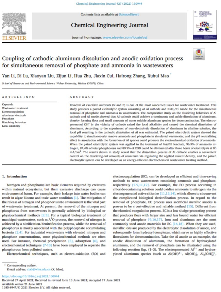武漢大學用我公司生產的BOD-Q水質測定儀采集的BOD數據在國際期刊《Chemical Engineering Journal》上發表題為“Coupling of cathodic aluminum dissolution and anodic oxidation process for simultaneous removal of phosphate and ammonia in wastewaters”的論文,研究使用我司生產的BOD-Q水質測定儀對垃圾滲濾液的BOD進行了測定,該論文的發表標志著我司儀器的測定數據具有高度的精準性和可靠性,為今后科研人員了解并使用我司研發的儀器提供有益的參考。